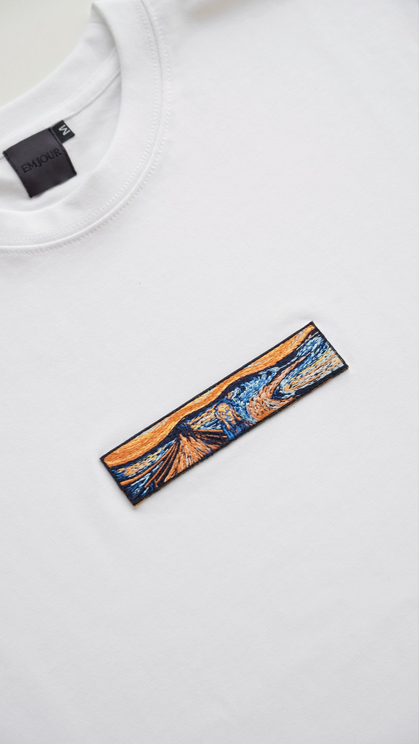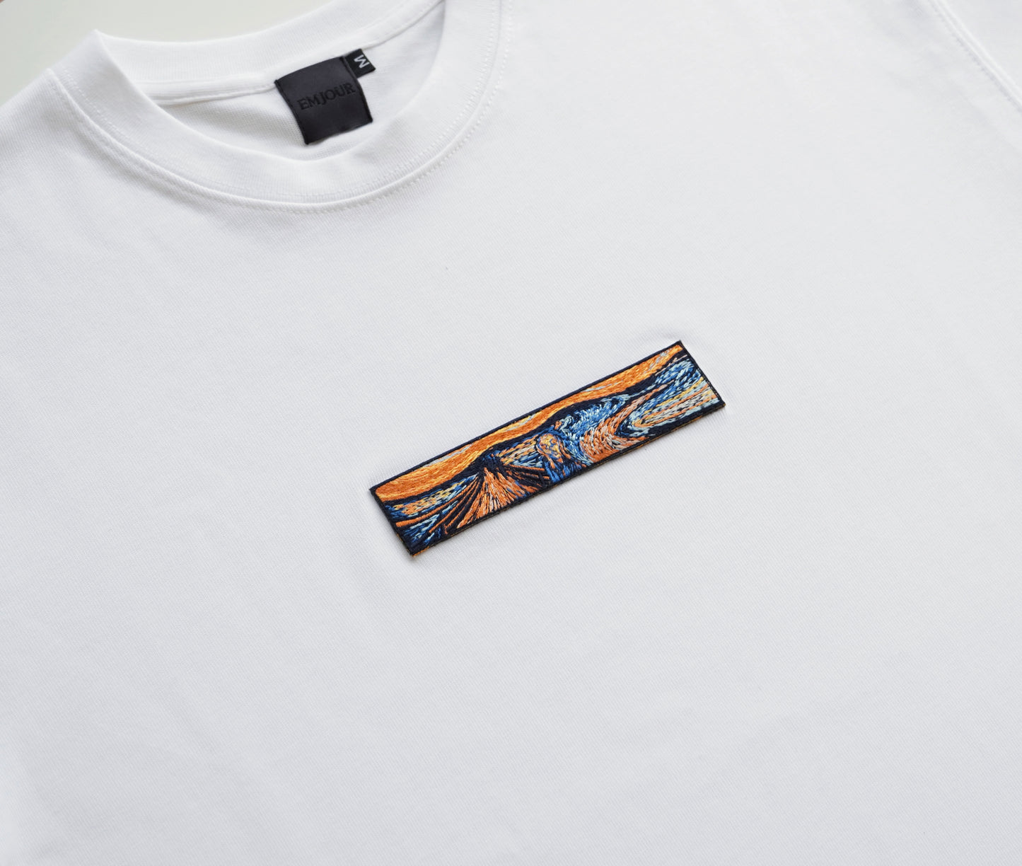 挑選顏色和諧的繡線,選用厚磅落肩短袖T恤,穿起來更顯立體感